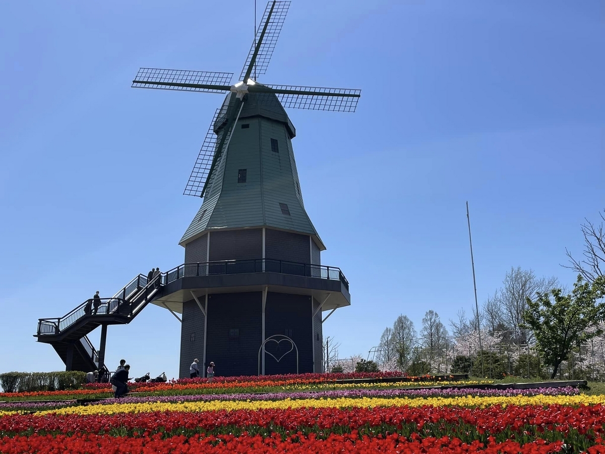 オランダ型風車を背景に、色とりどりのチューリップが咲き誇っていてとても綺麗でした(*´▽`*)