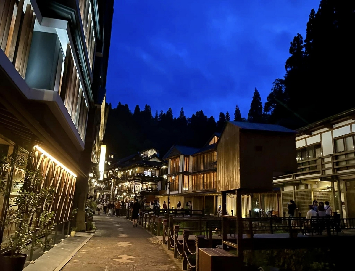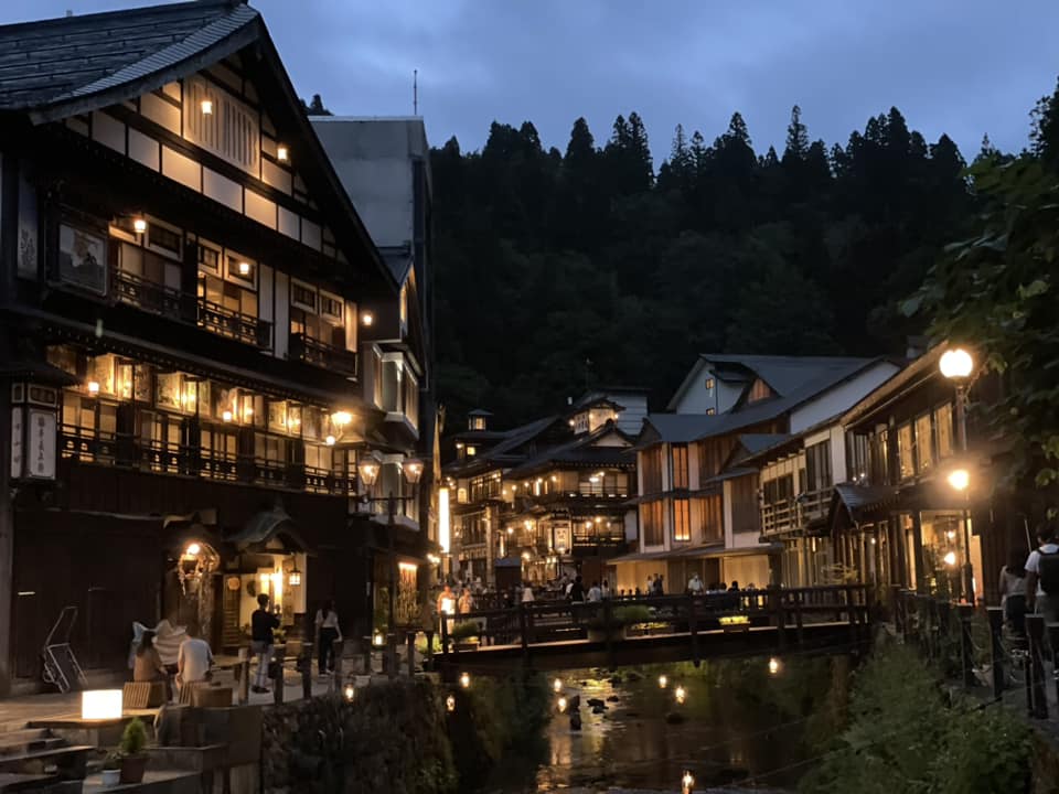 温泉街の中央を流れる銀山川をはさんで建ち並ぶ、大正レトロな木造の旅館。そんな旅館の数々をより幻想的にうつしだすガス灯の灯り♡