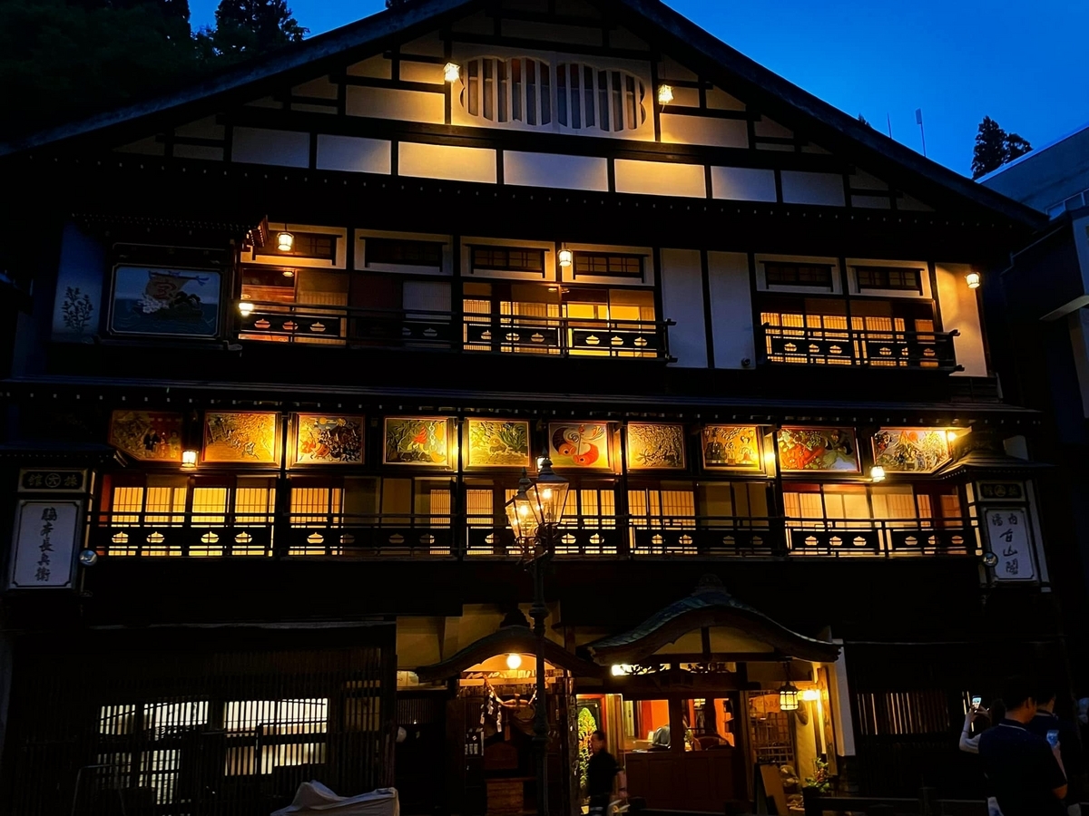 銀山温泉の共同駐車場から歩いて行き、比較的手前に位置するお宿・古山閣!大正4年に建設された木造4階建ての温泉宿で、2階の壁にはお見事な鏝絵が彩られています。